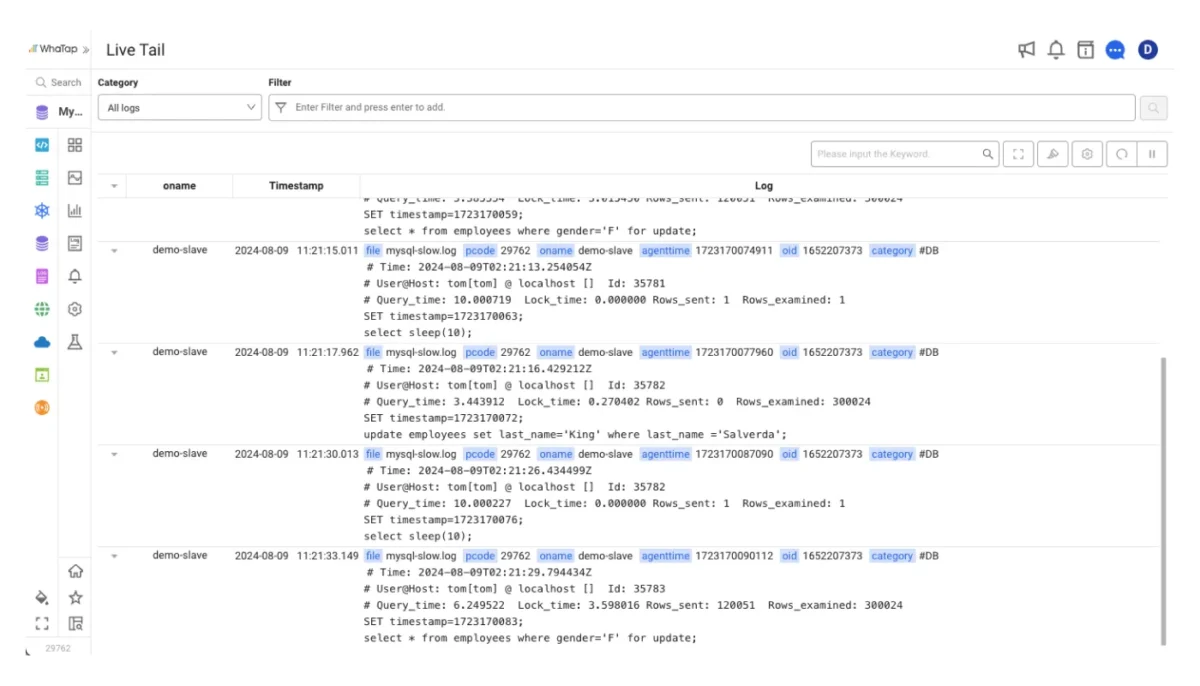 Kurulu veritabanları, Bulut ve açık kaynak veritabanlarına ait logları ve olay kayıtlarını, Canlı Takip (Live Tail) ve Log Arama (Log Search) özellikleri ile tek bakışta görebilirsiniz.
