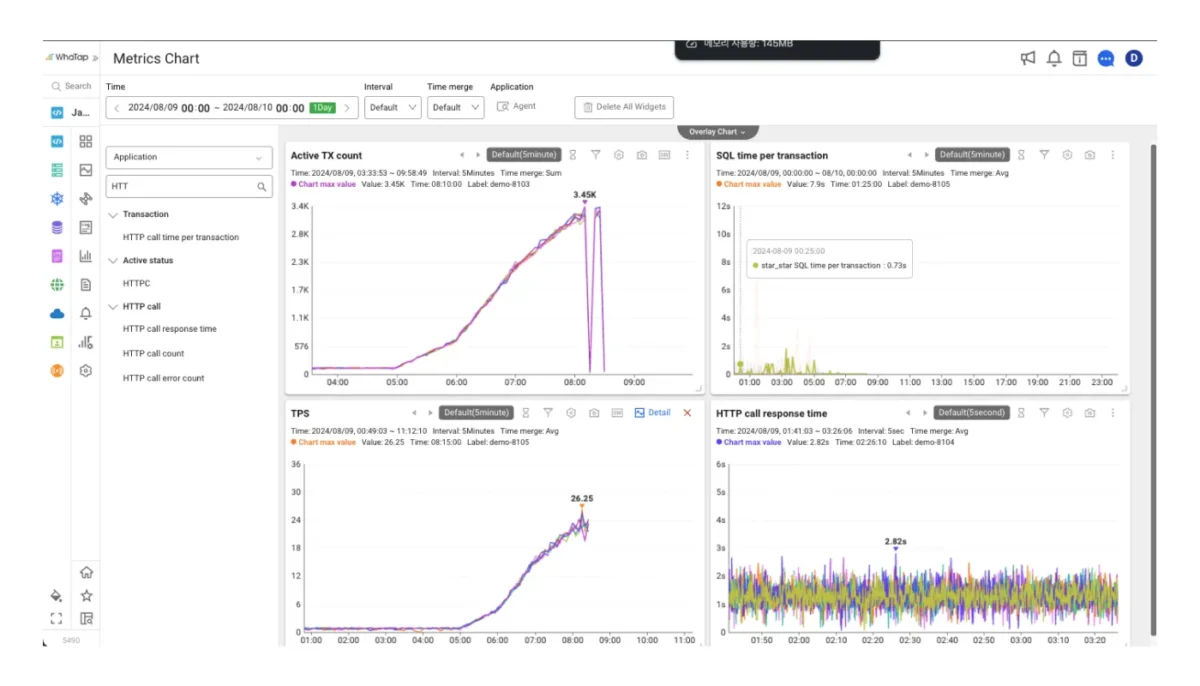 Zaman eksenine dayalı çeşitli metrikleri aynı anda inceleyebilirsiniz. Yanıt süresinin, hata sayısının veya işlem hacminin (throughput) yükseldiği belirli zaman dilimlerini kontrol edebildiğiniz için, aynı zaman dilimindeki sorunlu faktörleri hızla belirleyebilir ve hizmet durumunu doğru bir şekilde görüntüleyebilirsiniz.