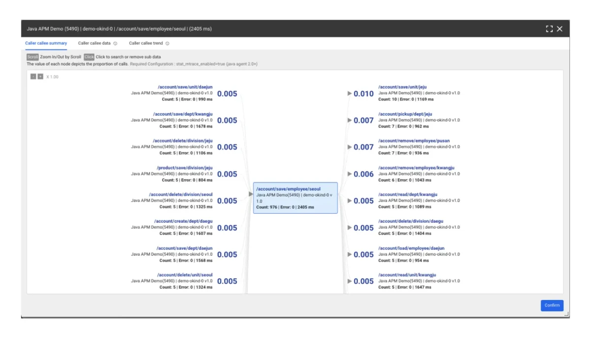 Çoklu işlem izleme yoluyla toplanan işlemler arasındaki çağrı oranını analiz eder. Mikroservisler arası bağımlılıkları örnek düzeyinde değil, URL düzeyinde kontrol ederek, karmaşık çağrı yapılarına sahip uygulama yollarını yönetmenizi ve optimum uygulama performansını sürdürmenizi sağlar.