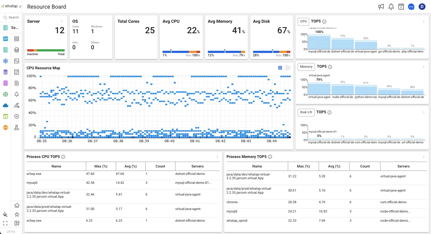 Sizin ihtiyaçlarınıza göre görev ve sunucu bazlı ajan gruplaması yaparak etkili izleme yöntemleri sunuyoruz. WhaTap kontrol paneli, aktif ve tamamlanmış işlemlerin bilgilerini anlık olarak günceller ve görsel grafikler sayesinde hizmet ve sistemlerin mevcut durumunu sezgisel olarak kavramanızı sağlar.