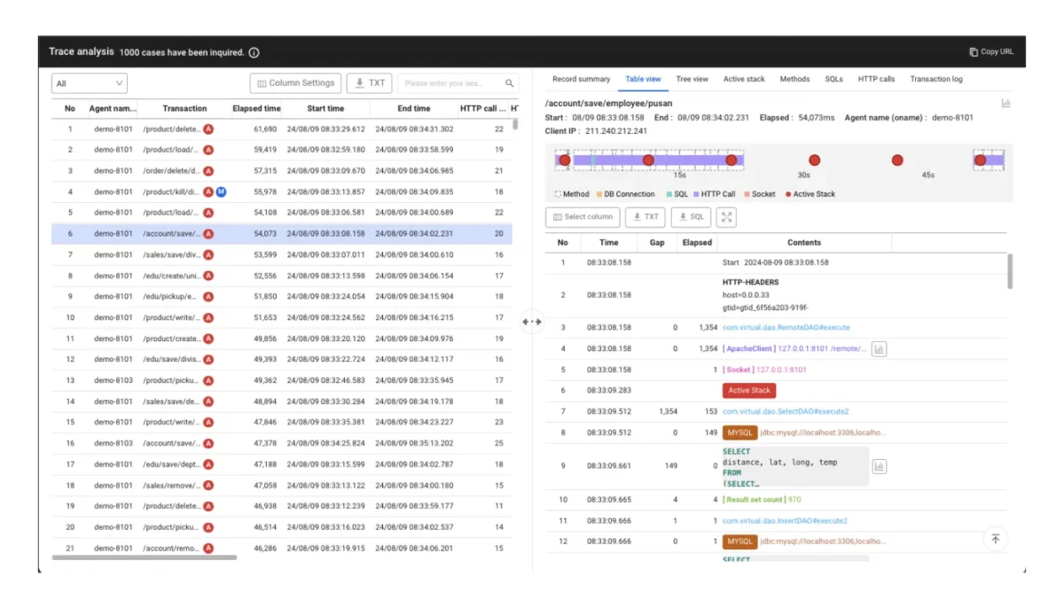SQL ve HTTP çağrılarının ötesine geçerek, metot düzeyine kadar izleme yapın. WhaTap’in benzersiz “Aktif Yığın” özelliği ile ayarsız ve zahmetsizce detaylı metot analizi gerçekleştirin.